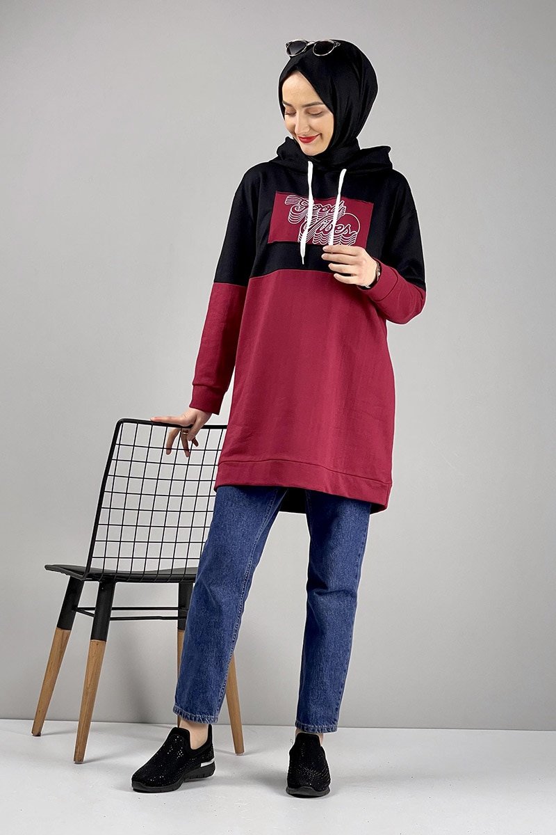 MODAPİNHAN Bordo Baskılı Kapüşonlu Tunik