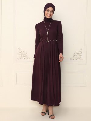 AYŞE MELEK TASARIM Mürdüm Boncuk Detaylı Abiye Elbise