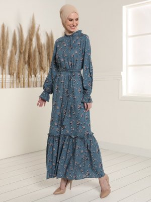 Tavin İndigo Doğal Kumaşlı Kuşaklı Çiçek Desenli Elbise