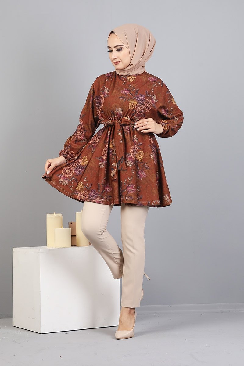 ELİZA MODA Kahverengi Desenli Bel Büzgülü Tunik