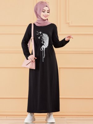 Tofisa Siyah Belden Bağcıklı Desenli Elbise