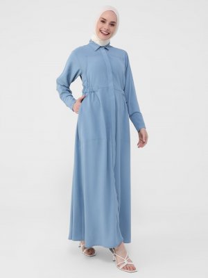 Refka Açık İndigo Aerobın Kumaşlı Gizli Patlı Gömlek Elbise