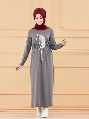 Tofisa Antrasit Belden Bağcıklı Desenli Elbise