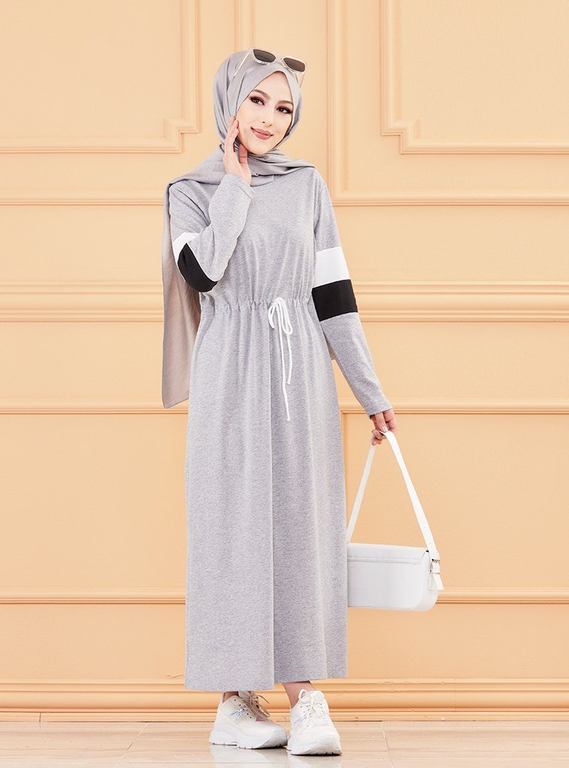 Tofisa Gri Kolları Şeritli Belden Bağcıklı Elbise