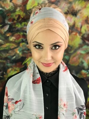 BUTİK AMBAR Açık Sütlü Kahve Çiçekli Fularlı Bone