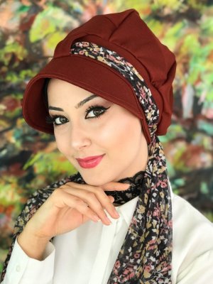 BUTİK AMBAR Bordo Tek Biritli Çiçekli Fularlı Şapka