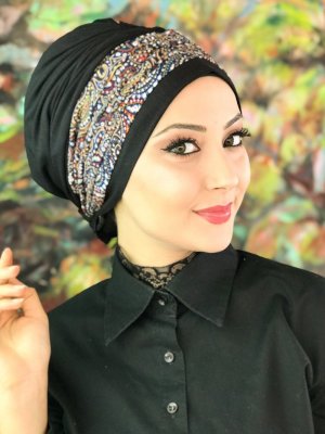 BUTİK AMBAR Krem Önü Şal Desenli Büzgülü Tokalı Bone