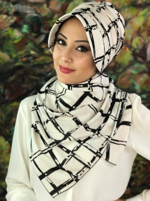 BUTİK AMBAR Beyaz Ekoseli Lastik Tokalı Şapka Şal