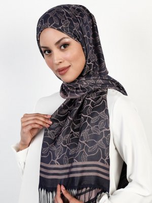 Balse Eşarp Lacivert Pudra Viskon Yaprak Desen Şal