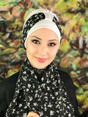 BUTİK AMBAR Krem Siyah Çiçekli Fularlı Tek Biritli Bone