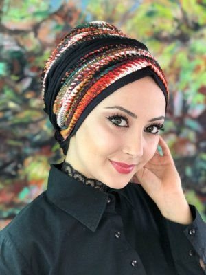 BUTİK AMBAR Siyah Etnik Desenli Büzgülü Tokalı Bone