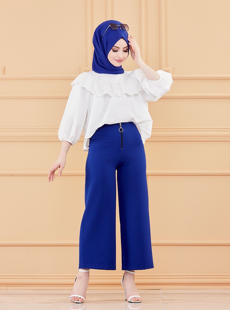 Tofisa Saks Geniş Paça Fermuarlı Pantolon