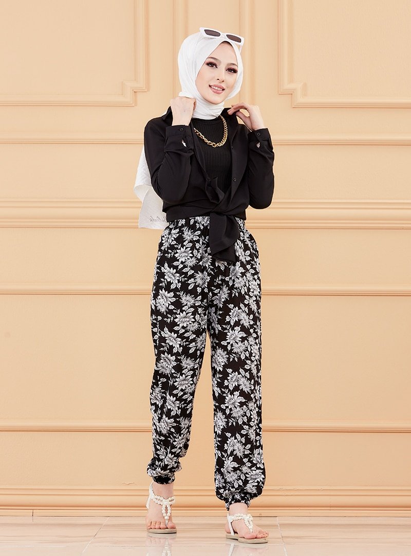 Tofisa Siyah Çiçek Desenli Pantolon