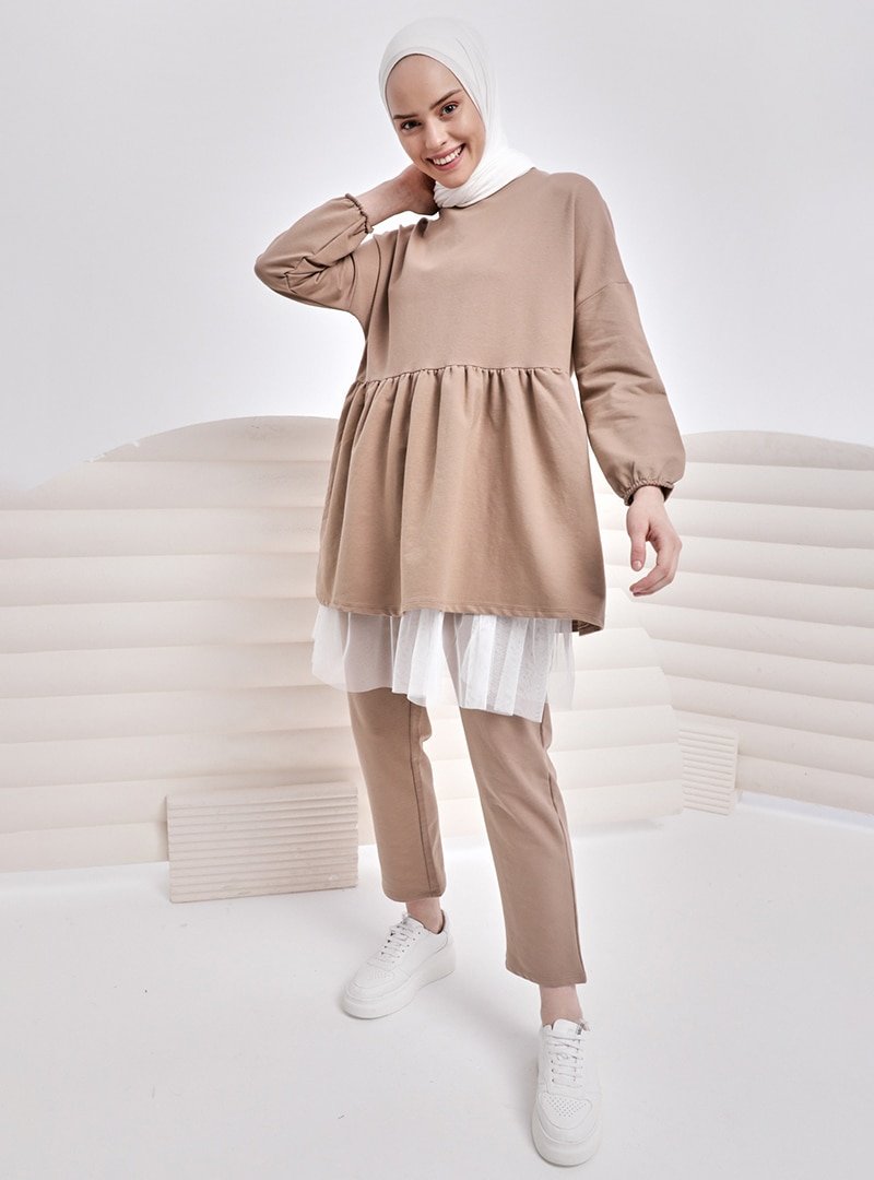 İnşirah Camel Doğal Kumaşlı Tunik & Pantolon Takım