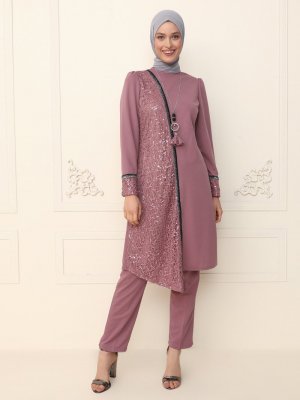 AYŞE MELEK TASARIM Koyu Gül Kurusu Tunik&Pantolon İkili Abiye Takım