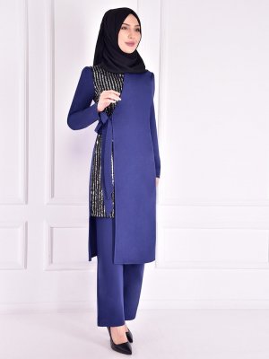 AYŞE MELEK TASARIM Koyu İndigo Bağlamalı Tunik&Pantolon Abiye Takım
