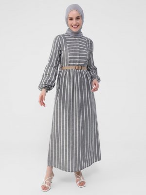 Refka Lacivert Doğal Kumaşlı Çizgi Desenli Elbise