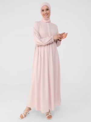 Refka Derin Pembe Nopeli Kumaştan Kolları Lastikli Salaş Elbise