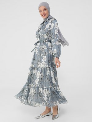 Refka Mavi Beyaz Simli Şifon Gömlek Elbise
