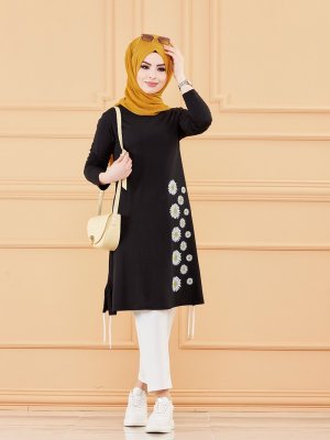Tofisa Siyah Çiçek Desenli Tunik