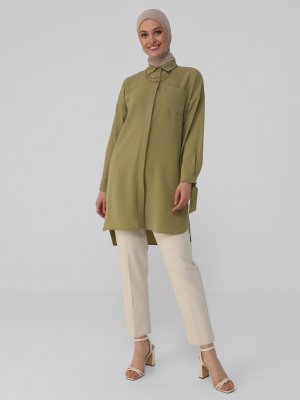 Refka Yağ Yeşili Bağlama Detaylı Arkası Uzun Tunik