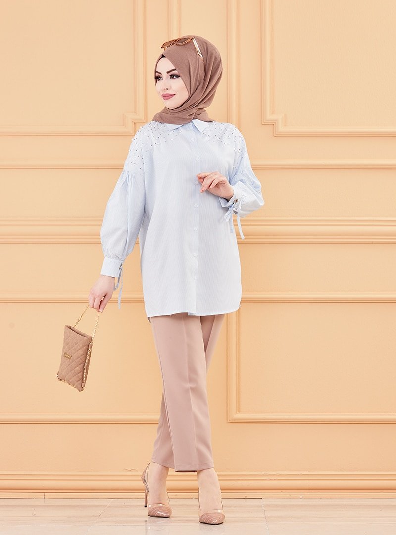 Tofisa Mavi Açık İnci Detaylı Düğmeli Tunik