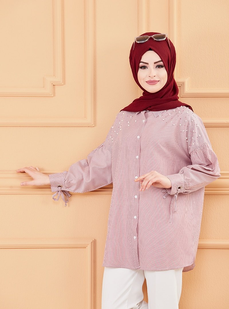 Tofisa Bordo İnci Detaylı Düğmeli Tunik