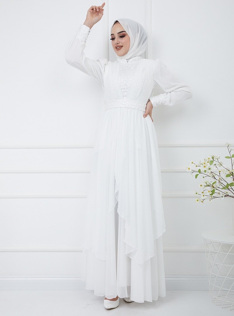 Olcay Ekru Dantel ve Plise Detaylı Şifon Abiye Elbise