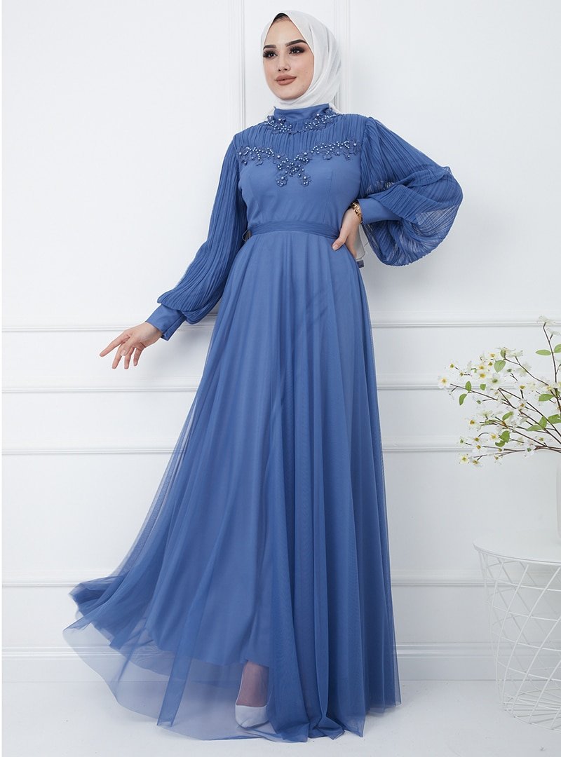 Olcay İndigo Robası ve Kolları Pilise Detaylı Önü İşlemeli Abiye Elbise