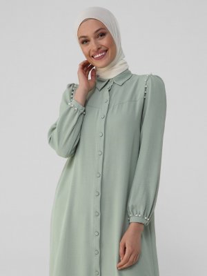 Refka Mint İnci İşlemeli Kuşaklı Gömlek Elbise
