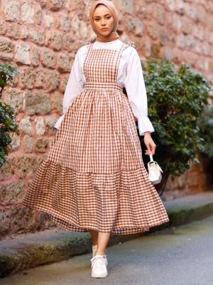 Meqlife Kahverengi Camel Pötikare Jile Elbise
