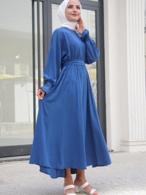 Meqlife Mavi Bella Kuşak Detaylı Elbise