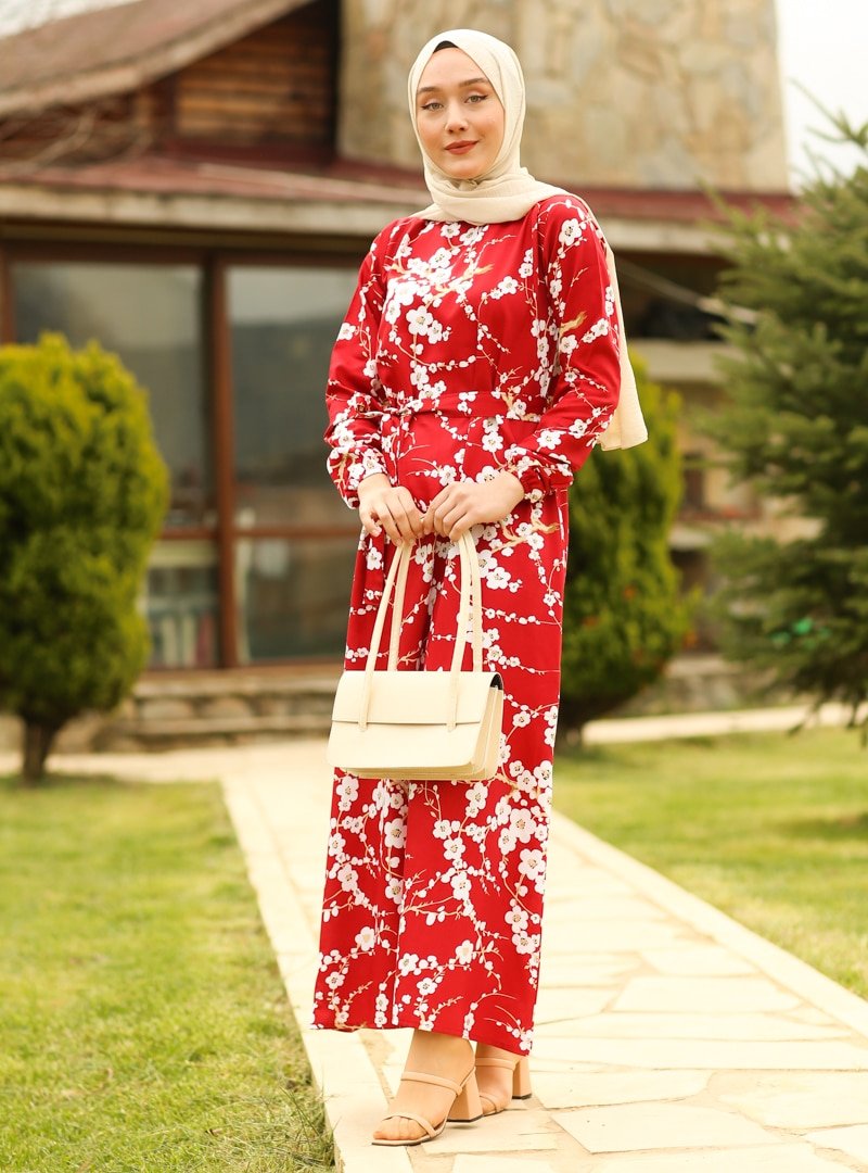 Ceylan Otantik Kırmızı Japon Çiçeği A Kesim Elbise