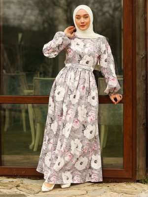 Ceylan Otantik Gri Çiçekli Belden Robalı Elbise