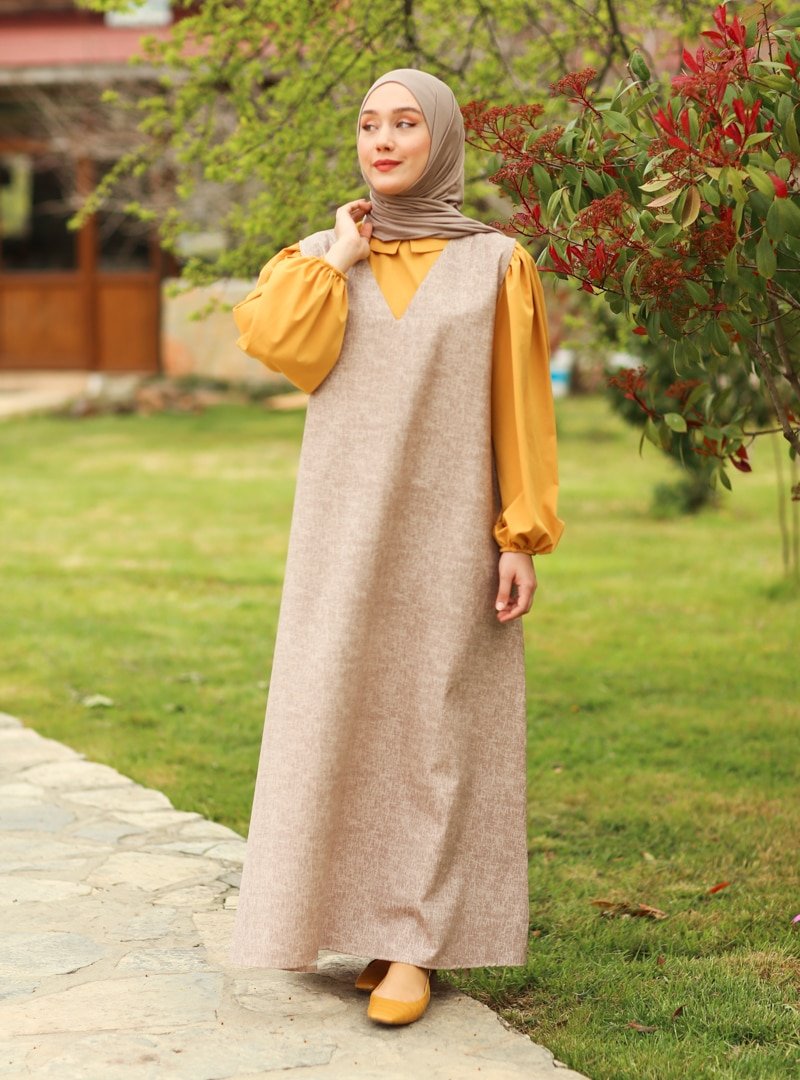 Ceylan Otantik Vizon Kanvas V Yaka Jile Elbise