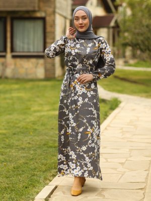 Ceylan Otantik Gri Japon Çiçeği A Kesim Elbise