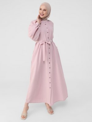 Refka Derin Pembe Waffle Efektli Dokulu Kendi Kumaşından Kemerli Elbise