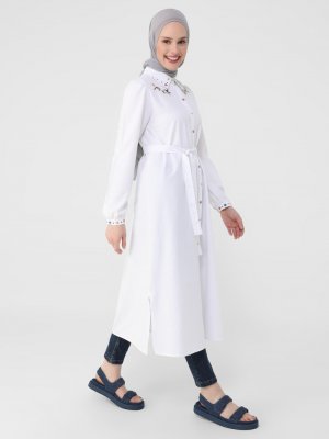Refka Beyaz Çiçek Nakışlı Yırtmaçlı Poplin Tunik Elbise