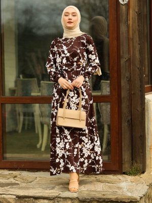 Ceylan Otantik Kahve Japon Çiçeği A Kesim Elbise