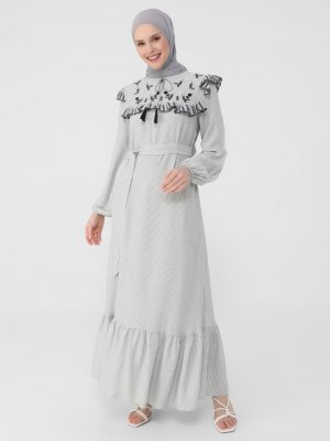 Refka Lacivert Nakış Ve Fırfır Detaylı Kendi Kumaşından Kemerli Çizgili Elbise