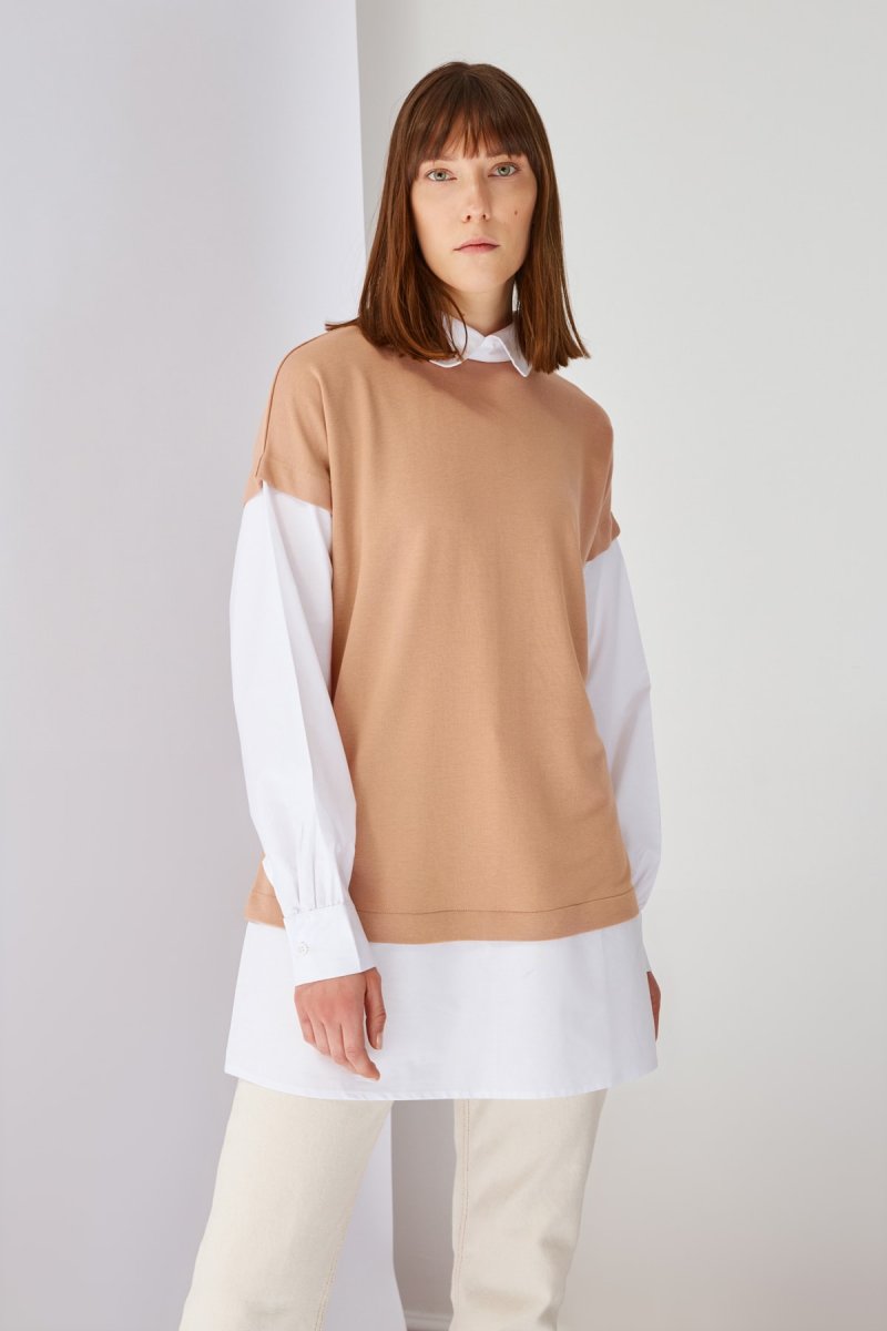 Trendyol Modest Bej Örme İçten Gömlek Çıkmalı Tunik