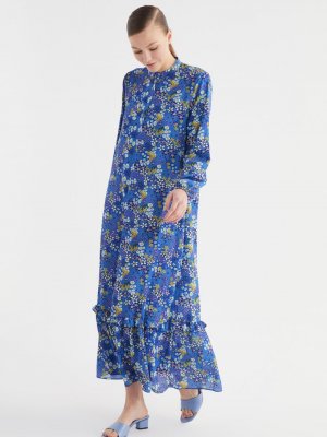 Trendyol Modest Lacivert Fırfırlı Desenli Krep Elbise