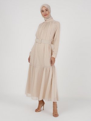LOREEN Bej Kemerli Fırfır Detaylı Elbise