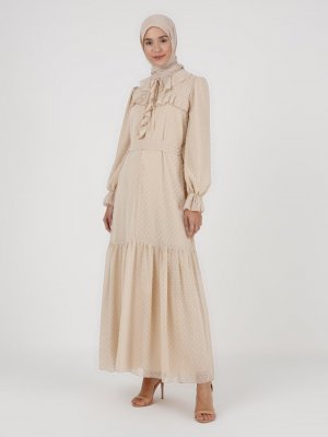 LOREEN Bej Fırfırlı Kol Uçları Lastik Detaylı Elbise