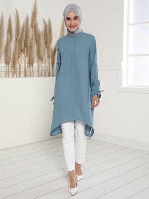 Tavin İndigo Kol Uçları Bağcık Detaylı Yırtmaçlı Tunik