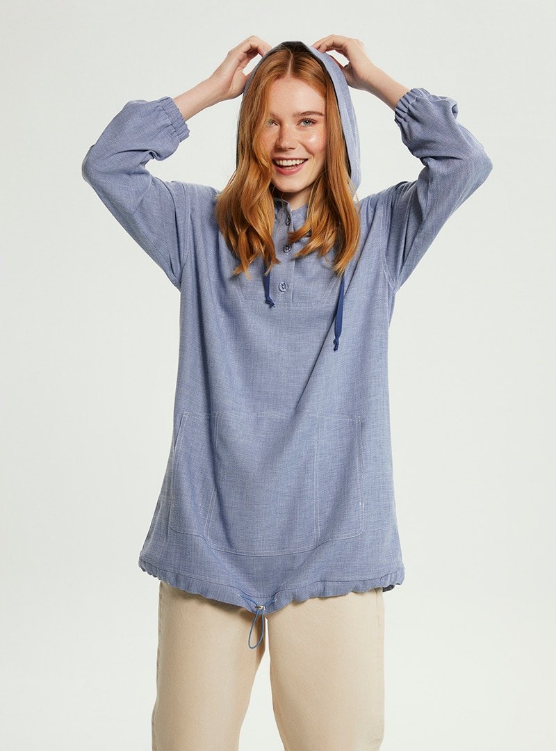 Muni Muni İndigo Keten Görünümlü Kapüşonlu Tunik