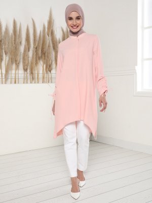 Tavin Pudra Kol Uçları Bağcık Detaylı Yırtmaçlı Tunik
