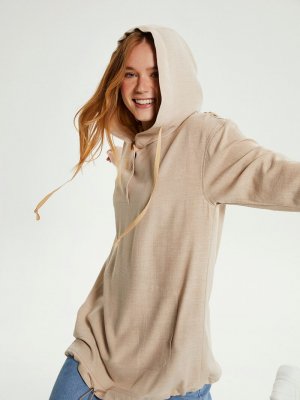 Muni Muni Bej Keten Görünümlü Kapüşonlu Tunik