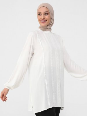 Refka Ekru Doğal Kumaşlı Güpür Detaylı Tunik