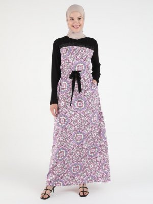 Ginezza Mor Beli Bağcıklı Desenli Elbise
